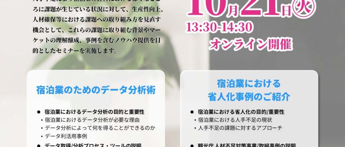 人手不足により宿泊業の経営における様々なところに課題が生じている状況に対して、生産性向上、人材確保等における課題への取り組み方を見直す機会として、これらの課題に取り組む背景やマーケットの理解醸成、事例を含むノウハウ提供を目的としたセミナーを実施します。
