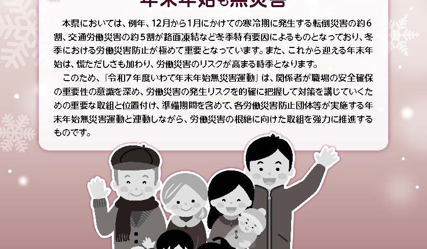 このため、「令和7年度いわて年末年始無災害運動」は、関係者が職場の安全確保の重要性の意識を深め、労働災害の発生リスクを的確に把握して対策を講じていくための重要な取組と位置付け、準備期間を含めて、各労働災害防止団体等が実施する年末年始無災害運動と連動しながら、労働災害の根絶に向けた取組を強力に推進するものとする。