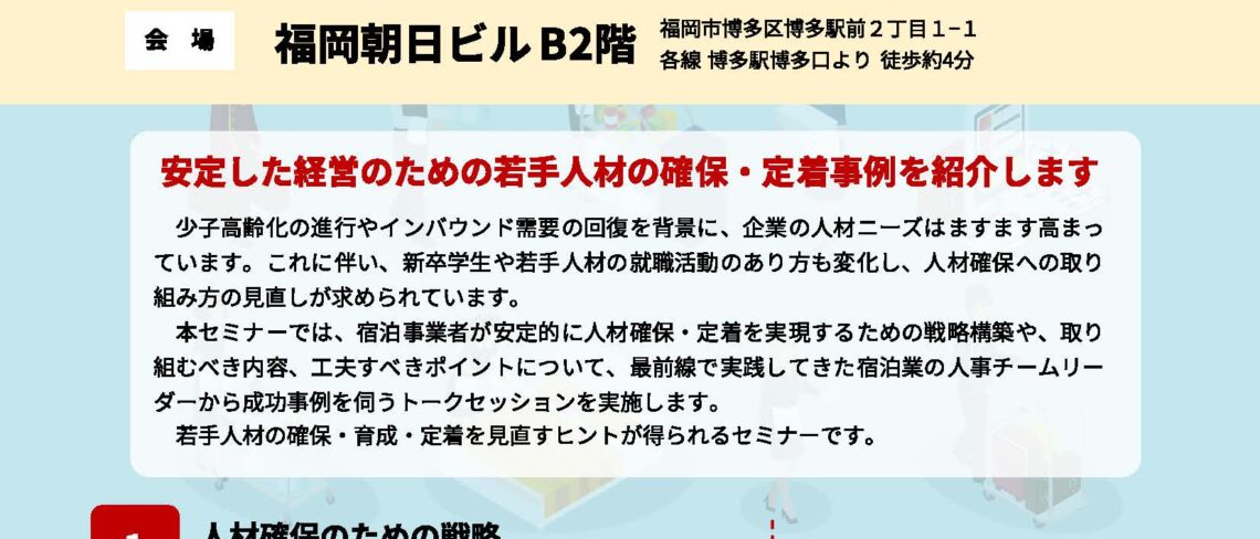本セミナーでは、主に「若手人材」に焦点をあて、継続的な人材獲得と定着を実現する宿泊事業者を招聘し、実際の取組み方や工夫するポイント等を紹介し、人材マーケットの現状を踏まえたこれからの取り組みのポイントについて解説します。
