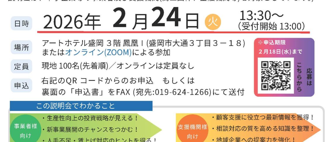 このたび岩手県中小企業団体中央会では、「生産性向上支援施策説明会」を開催いたします。
