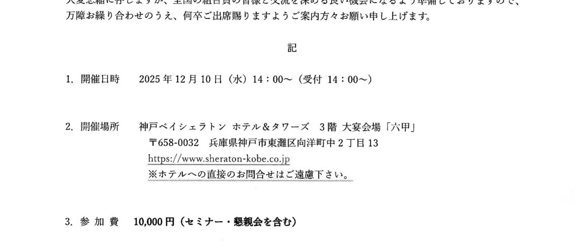 全旅連女性経営者の会(JKK)「2025年度オープンセミナー」 【JKK公開ワークショップ】開催 時下ますますご健勝のこととお慶び申し上げます。 日頃より、当会の事業推進につきましては、格別のご理解とご協力を賜り厚く御礼申し上げます。 さて、標記の件、この度6年ぶりにオープンセミナーを開催する運びとなりました。 業務ご多端の折り大変恐縮に存じますが、全国の組合員の皆様と交流を深める良い機会になるよ […]