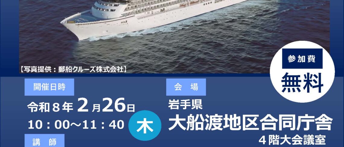 いわてクルーズセミナーin大船渡 令和7年度「いわてクルーズセミナーin大船渡」を開催します。 岩手県では、今後の更なるクルーズ船の寄港拡大等に向けて、「飛鳥2」・「飛鳥3」の船会社である郵船クルーズ株式会社様から講師をお迎えし、セミナーを開催します。 オプショナルツアー先に求められるもの、他の寄港地の優良事例など、実際にツアー造成を行うお立場から御講演いただきます。 【概要】 ○ 日時/令和8年 […]