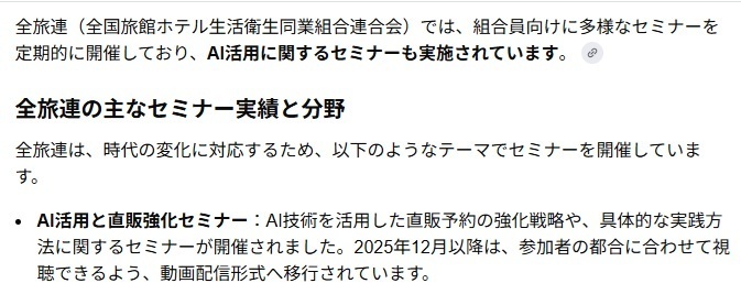 【全旅連】生衛業収益力向上セミナー 《宿泊業におけるAI活用セミナー》 全旅連第8部会(シン・価値創造部会)では「宿泊業におけるAI活用セミナー」をシリーズ(第10回目1/28開催)で、Chatgpt等のAI活用の基礎とAI利用の注意点などの知識を広げサービスの向上と生産性向上につなげていただくためのセミナーを開催しております。 Chatgpt等のAI活用の基礎とAI利用の注意点などの知識を広げサ […]