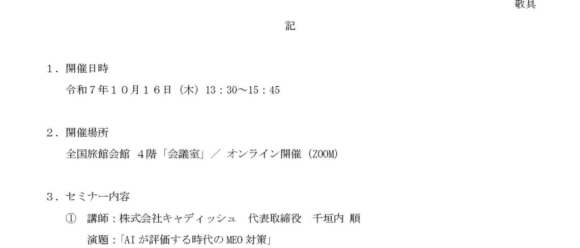 【全旅連】生衛業収益力向上セミナー 全旅連では「生衛業収益力向上セミナー」と題して、日々の経営での疑問点、今後の経営への視点など悩み不安等の解決に繫げていただくためのセミナーを開催しております。 開催日時 令和7年10月22日(水)10:30~12:00 開催場所 全国旅館会館 4階「全国旅館会館会議室」/ オンライン開催(ZOOM) 住所:東京都千代田区平河町2-5-5 セミナー内容 演題:「旅 […]